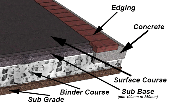 When preparing an area to be constructed, you have to consider it’s usage when calculating the necessary foundations. Construction varies depending on the use of the area to be resurfaced, and the sub base is of utmost importance. We always construct sub-bases to a minimum of 100mm for light use areas such as pathways, increasing to 150mm for a driveway and 225mm for a car park or access road. The sub-base is then followed by a binder course(s) and the surface course.